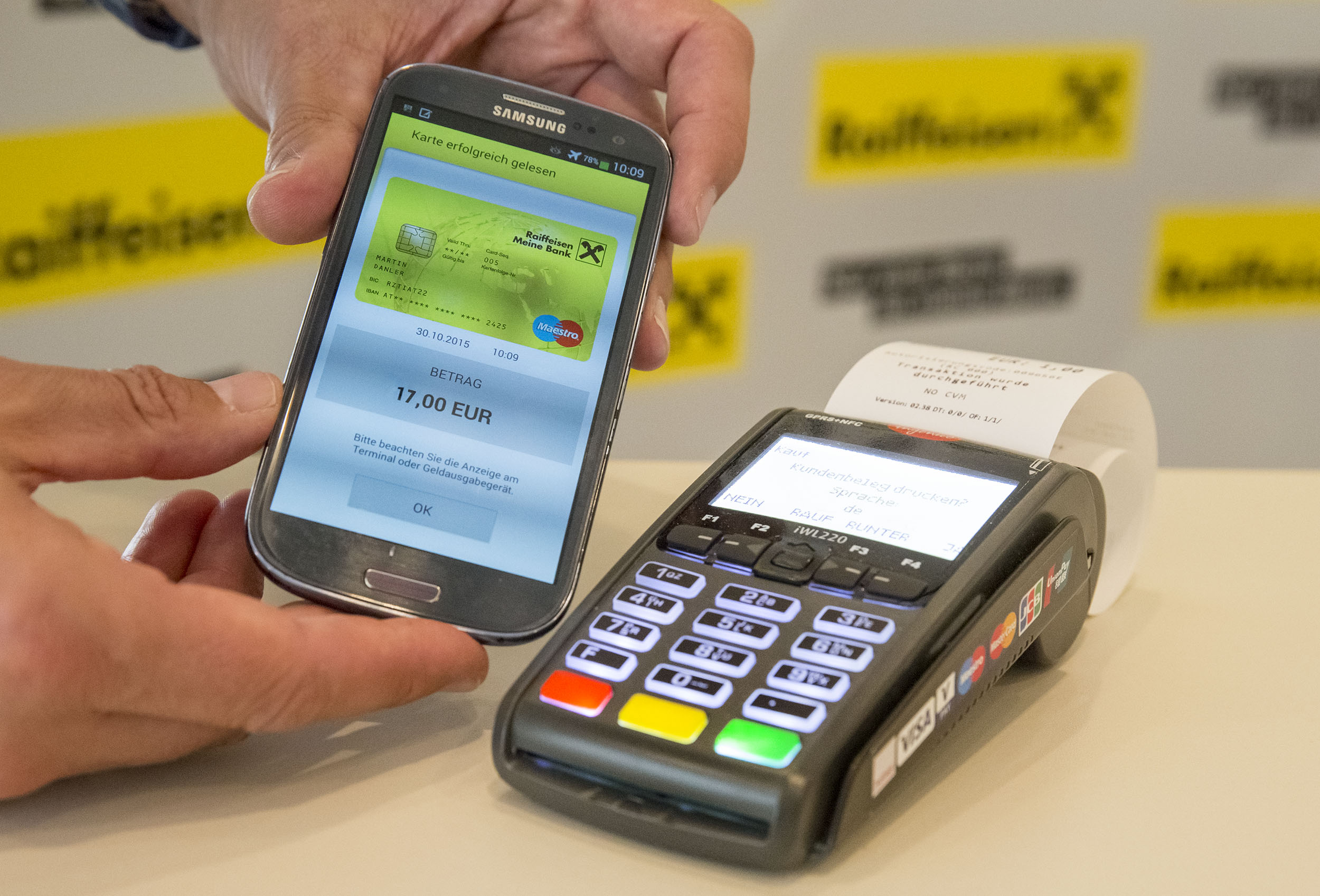 Ab sofort können Raiffeisenkunden an allen NFC-fähigen Kassenterminals mit ihrem Smartphone bezahlen. „Es funktioniert genauso einfach und sicher wie das herkömmliche Bezahlen mit der Bankomatkarte – nur schneller“, freut sich Stefan Lang, Produktmanager der Raiffeisen-Landesbank Tirol AG. Der große Vorteil: Bei der Near Field Communication ist bei Beträgen unter 25,– Euro, also bei kleinen Einkäufen im Handel, die Eingabe des PIN-Codes nicht notwendig.