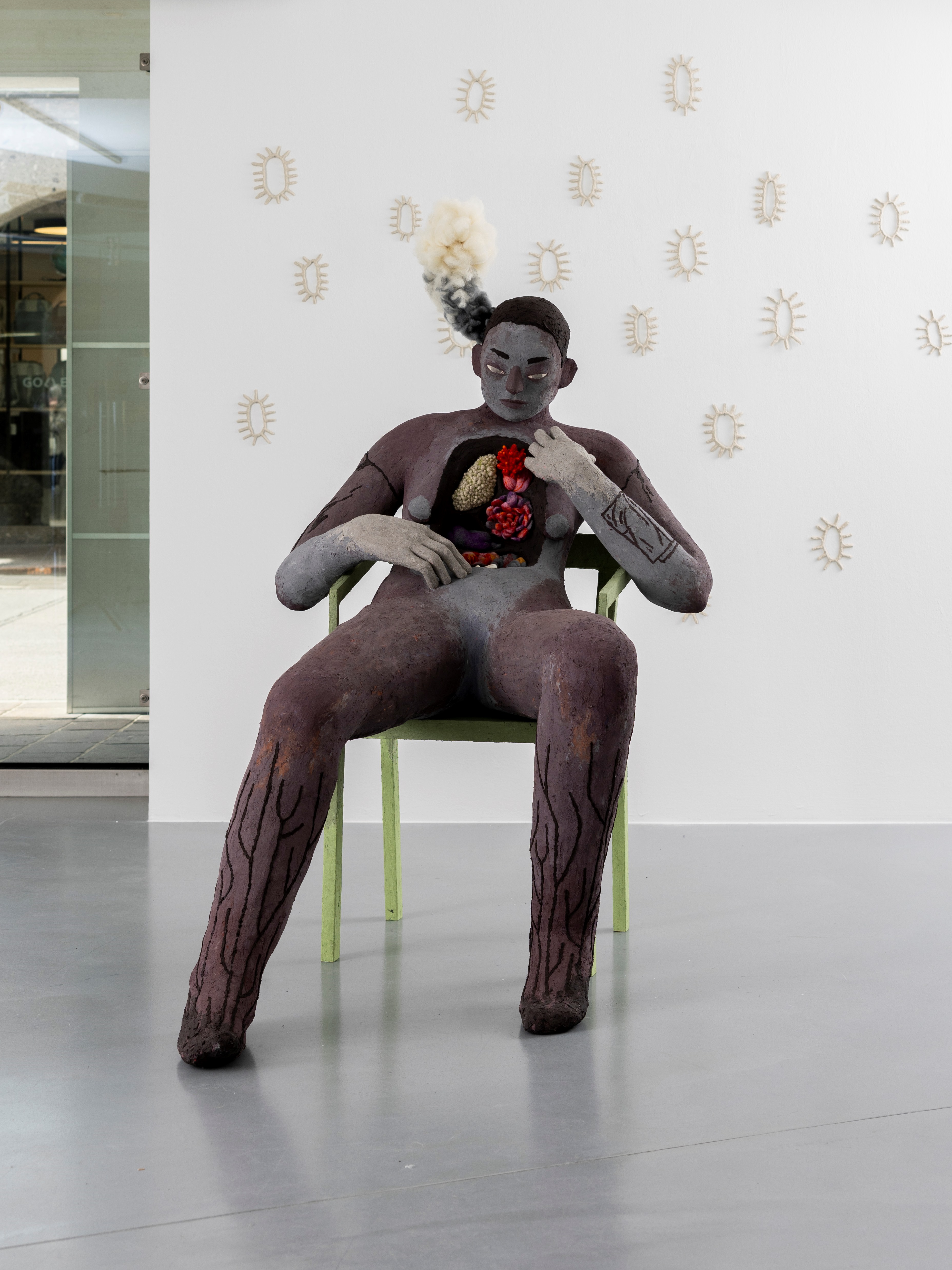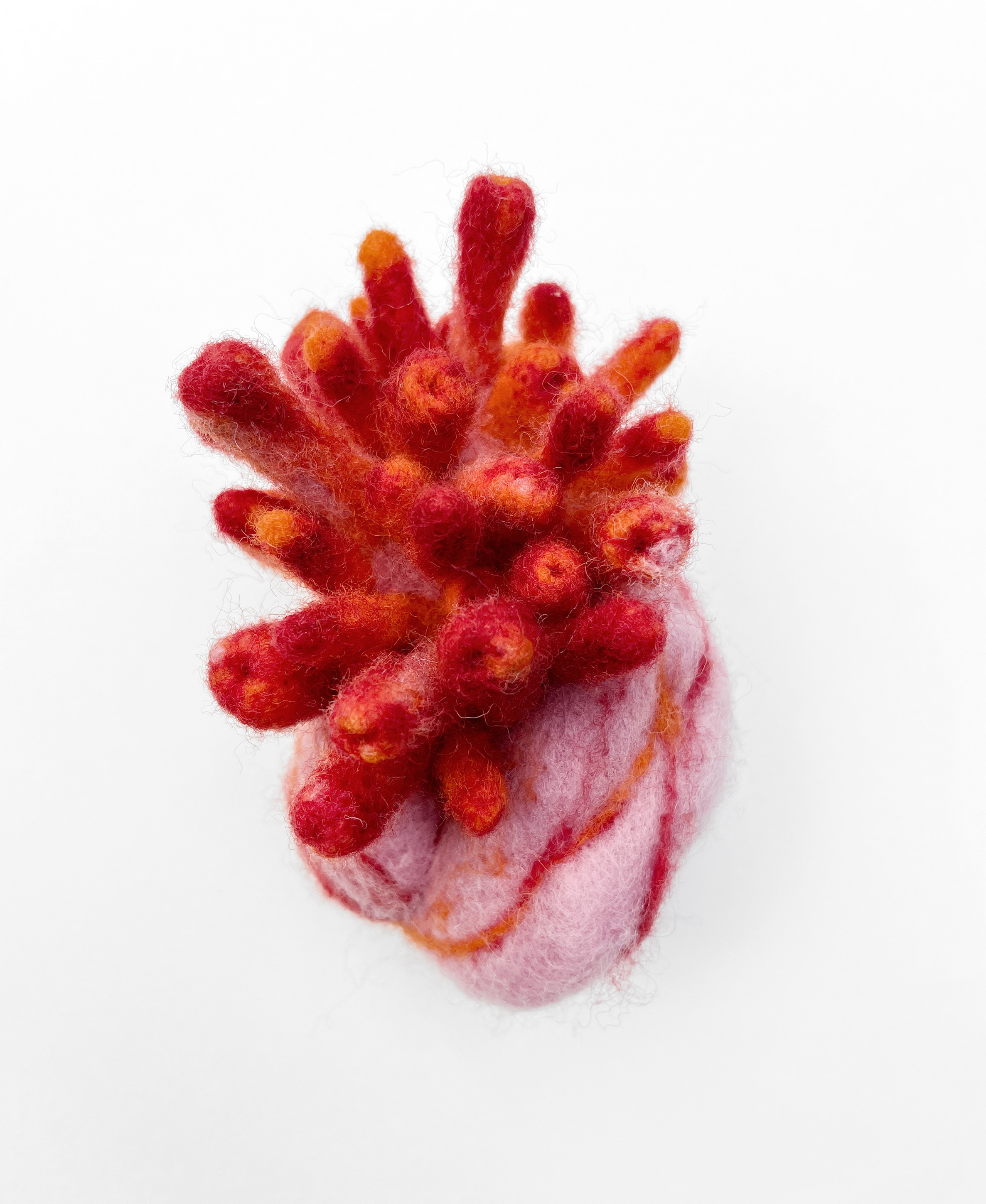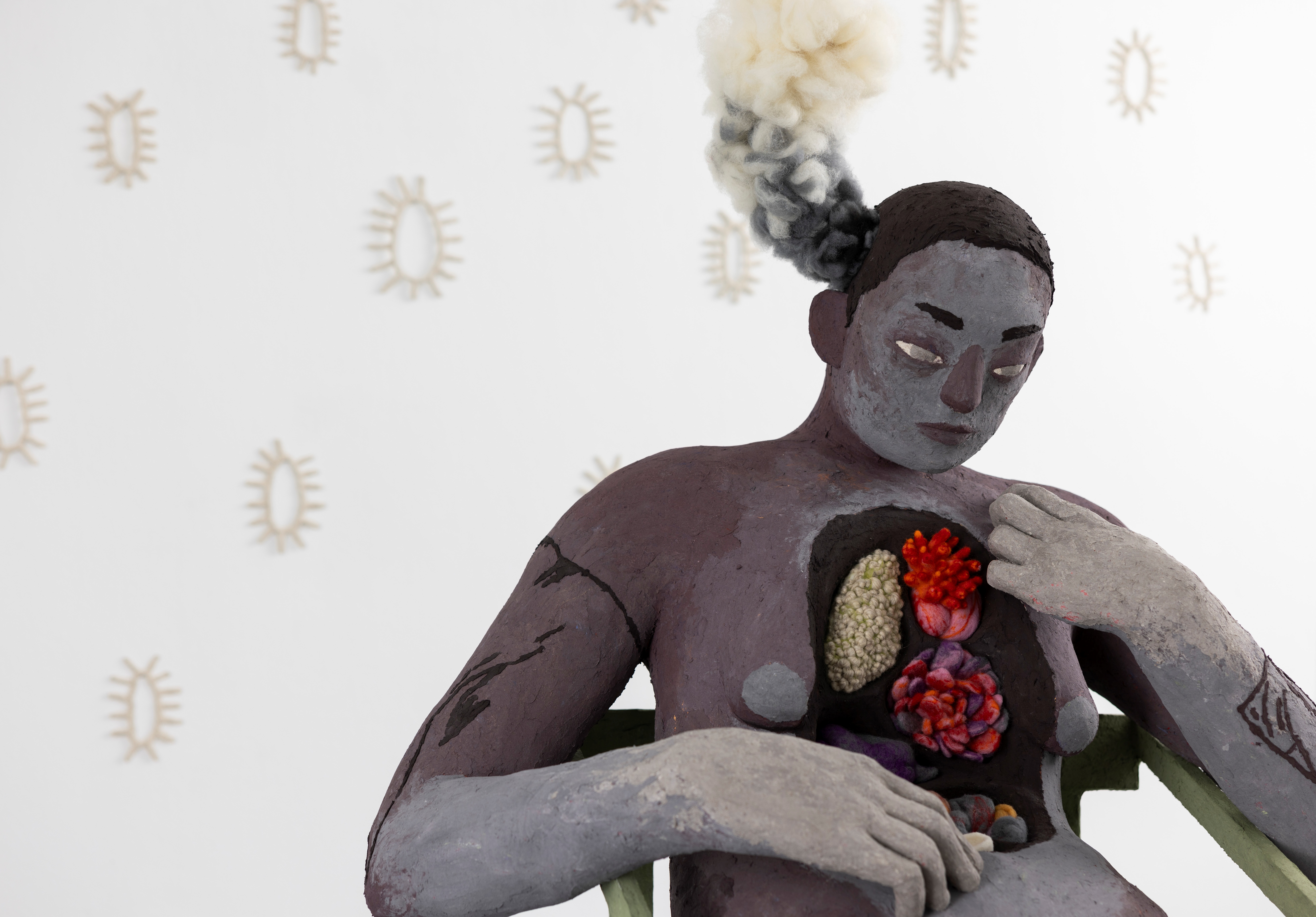 Im Zentrum der Ausstellung steht die lebensgroße Skulptur „Soror“ (lat. „Schwester“), die am Oberkörper symbolhafte Organe aus Filz zeigt. Neben Herz, Lunge, Leber, Magen, Darm und Gebärmutter findet sich auch das Gehirn vor, das nicht ohne Ironie als eine Art Rauchwolke aus dem Kopf wächst.