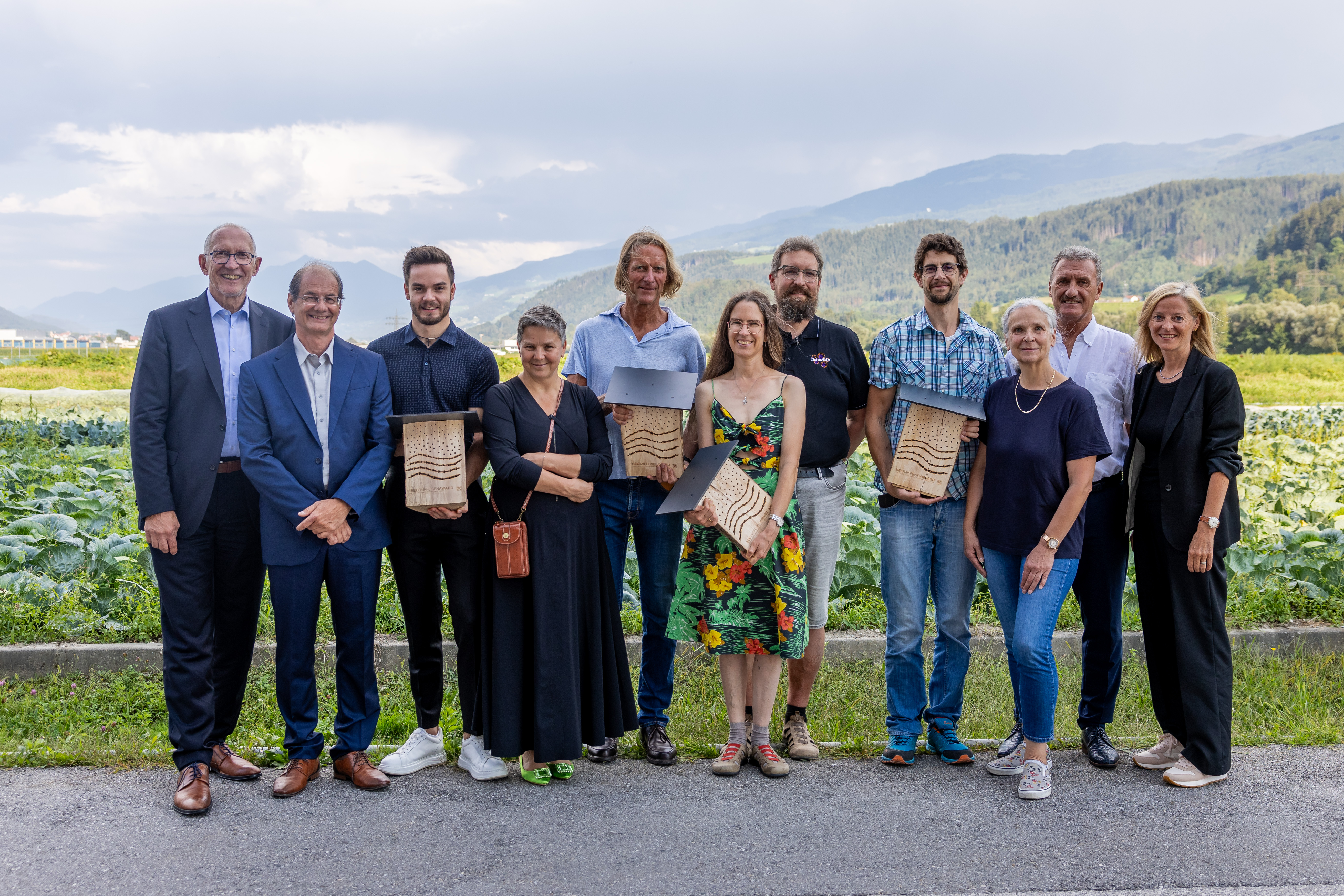 Den #beeraiffeisenAWARD in der Kategorie Gemeinden und Vereine nahmen der Brixlegger Bürgermeister Rudolf Puecher, die Obfrau des Umweltausschusses Lea Ventura und Umwelt- und Abfallberater Florian Jeram-Kofler für „Brixlegg blüht auf“ entgegen. Bereits 2018 hat sich Brixlegg dem Pilotprojekt „Blüten.Reich“ der Tiroler Umweltanwaltschaft angeschlossen. Allein in der großen Kreisverkehrsinsel beim Ortseingang wurden in der Folge gemeinsam mit freiwilligen Helfer:innen 7.500 Blumenzwiebeln gepflanzt und dann unerwünschte Beikräuter ausgejätet. Zudem wurden die Wildblumenflächen im Ort kontinuierlich erweitert. „Mit diesem konstanten Engagement gegen das Insektensterben hat sich Brixlegg als echte Vorzeigegemeinde positioniert“, urteilte die Jury. Mustergültig sei auch die kluge und liebevoll gestaltete Kommunikation für die Brixlegger Bürger:innen. Die Blumenwiese im Kreisverkehr hat man etwa sinnfällig „Nektar- und Pollentankstelle“ getauft, eine andere benannte man „Neuer Insektentreff beim alten Viehmarkt“ oder überaus kreativ „Air Bee'n Bee beim Bergbaumuseum“.